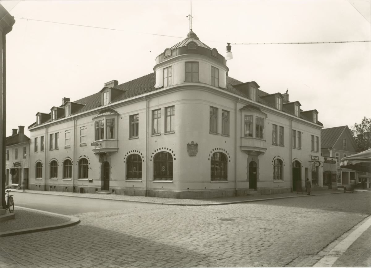 Bilden är tagen från hörnet Storgatan (höger) och Nya Stationsgatan. Ingången mot Nya Stationsgatan leder in till postkontoret medan ingången mot Storgatan leder in till banken. Längst till höger i fastigheten ligger Robert Nyvalls Ur- & Guldsmedsaffär. Fastigheten byggdes åren 1906 - 1907. På bankstämma 1930 fattades beslut om utvidgning av lokalerna, dels genom tillbyggnad och ändring av den av Kungliga Poststyrelsen förhyrda lokalen mot Nya Stationsgatan, dels genom en tillbyggnad mot Storgatan, varvid den fick det utseende som framgår av Olsons foto. Byggnaden revs i oktober 1953, och ett nytt bankkomplex uppfördes där nu Föreningssparbanken har sin verksamhet.