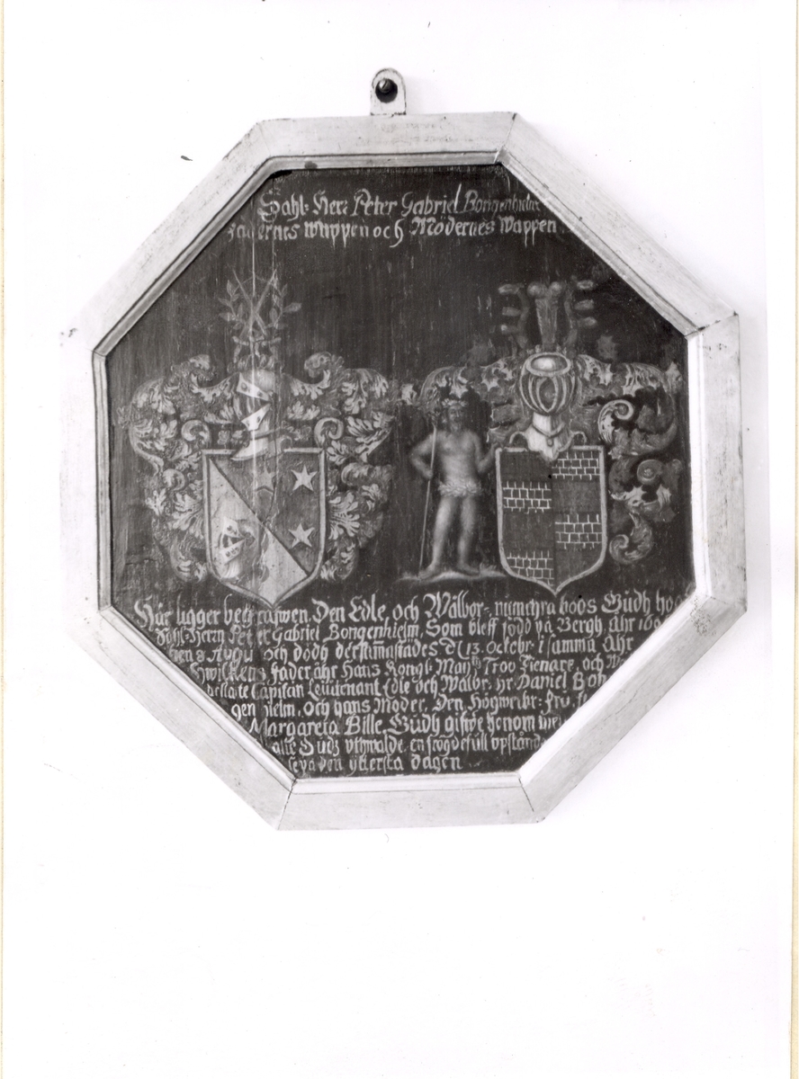 Begravningsvapen över Peter Gabriel Bongenhielm,son till kapten Daniel Bonge, nobil. Bongenhielm, på Berg. Konserverat av Sven Wahlgren 1939.