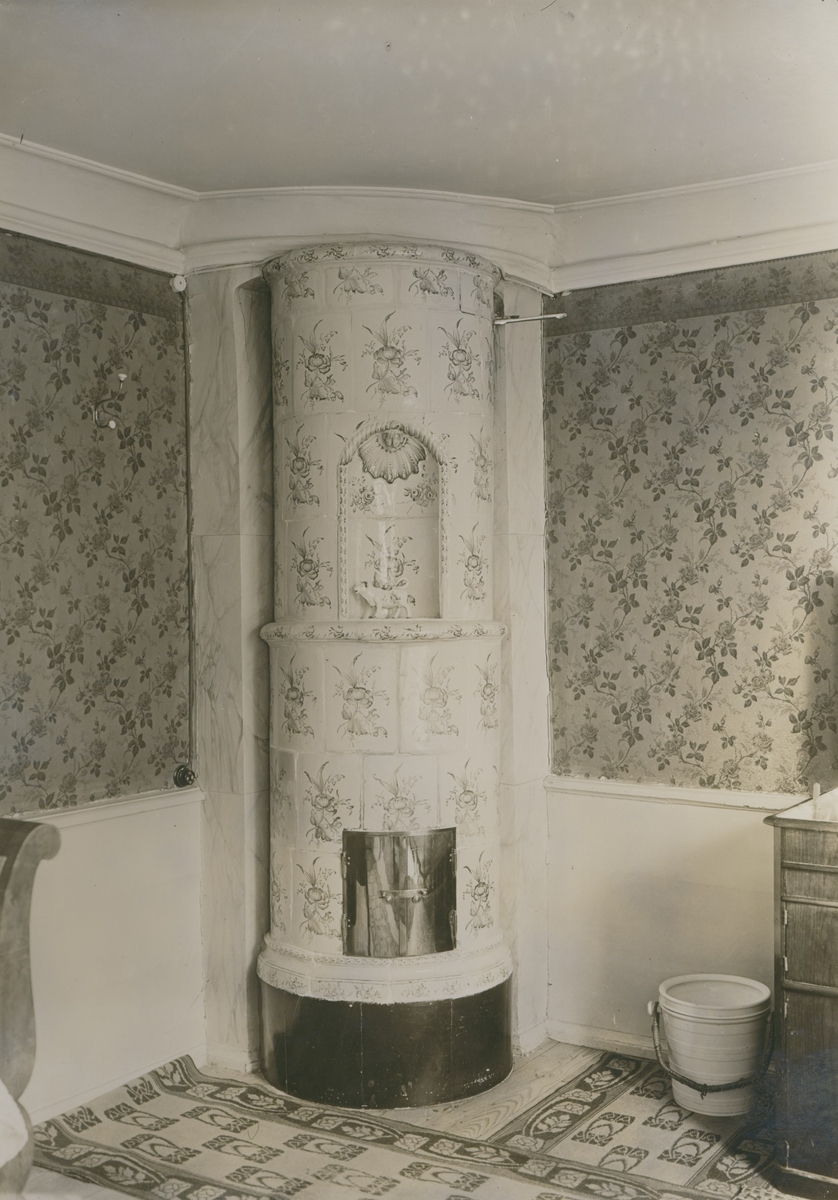 Kontorsflygeln på Skälby gård. Kakelugn med polykromdekor och nisch. Flyttad från huvudbyggnaden.