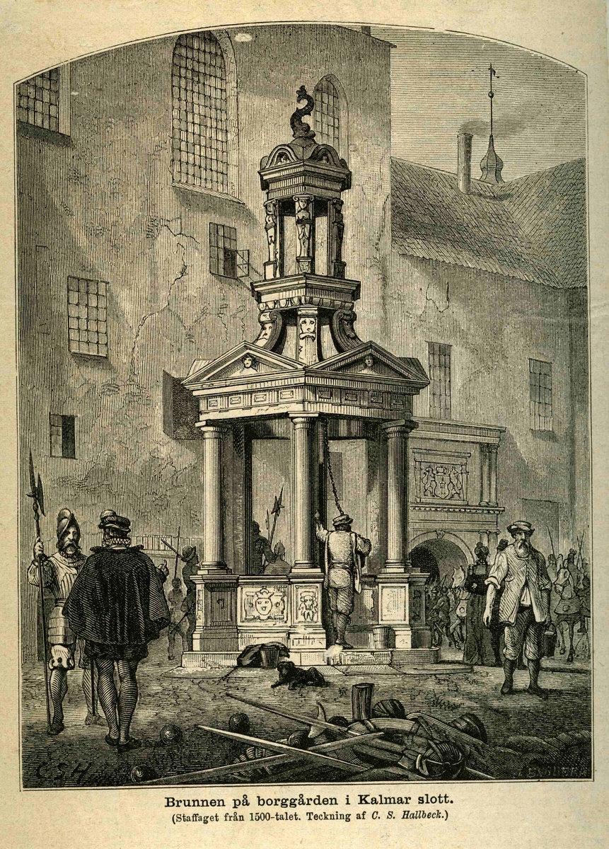 Brunnen på borggården i Kalmar slott.( Staffaget från 1500-talet. Teckning af C.S Hallbeck.)
