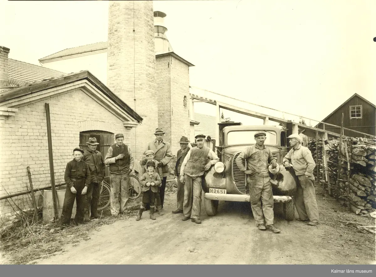 Disponent Oskar Jonsson och ett antal arbetare framför Kalksandstegelfabriken