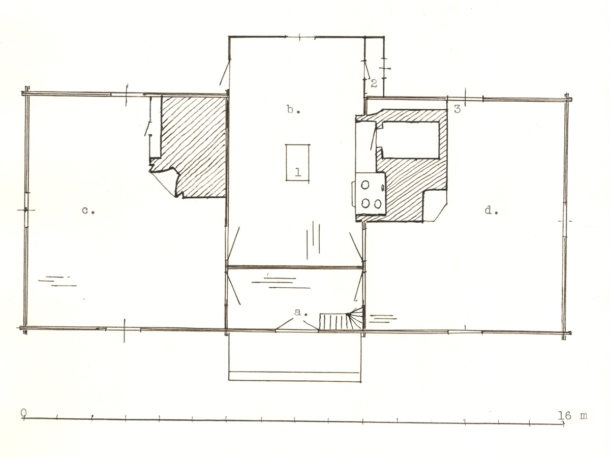 Plan av stuga i två våningar. a. Förstuga, b. Kök 1. Källarlucka 2. Skafferi c. Stuga d. rum 3. Igensatt påugn.