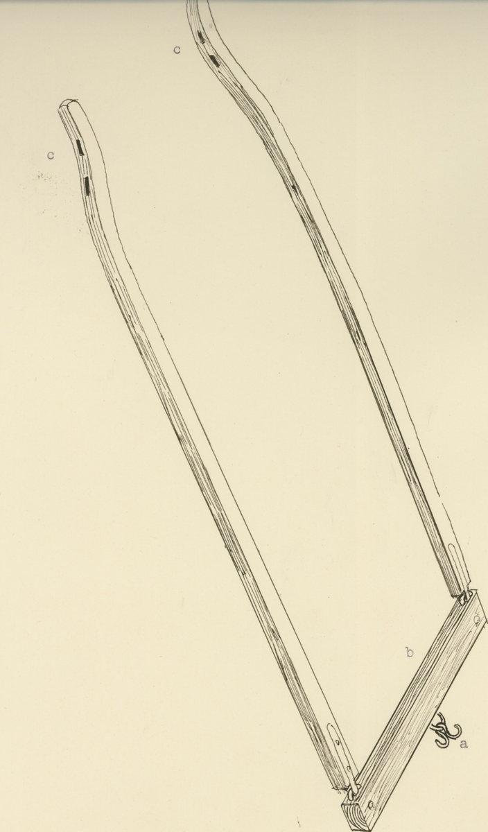 Harvesdrag. Längd 200 cm, bredd 70 cm. a. Harveskrok b. Harvesslå c. Selatamphål