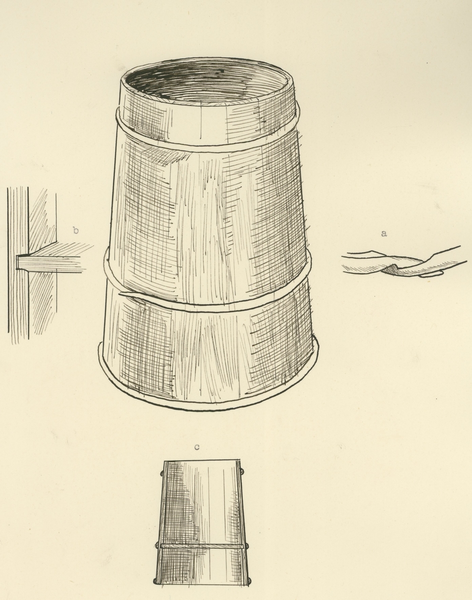 Hel och Halvskäppa. a. Svep b. Botten c. Tvärsnitt. Innermått: Övre del; höjd, 36 cm, 32 cm i diameter. Nedre del; höjd 17 cm, 34 cm i diameter.
