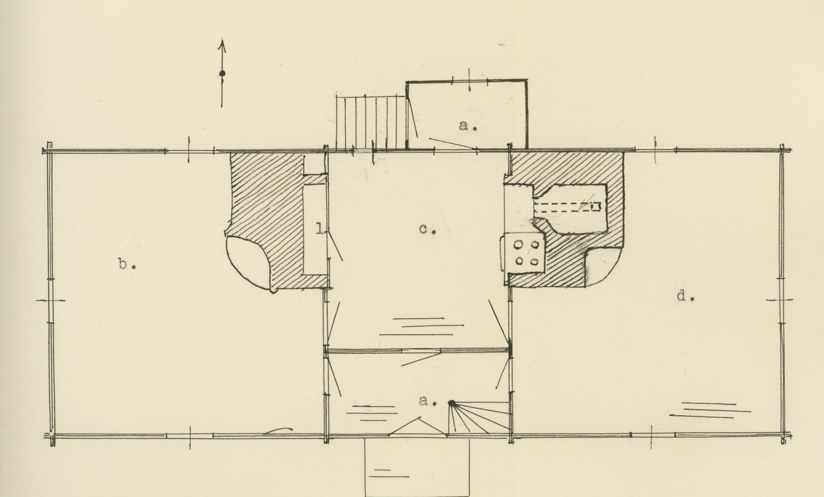 Plan av stuga i Långeruda (två våningar). a. Förstuga b. Stuga c. Kök (tidigare delat; två spisar) 1. Gammal spis förbyggd med brädvägg. d. Rum.