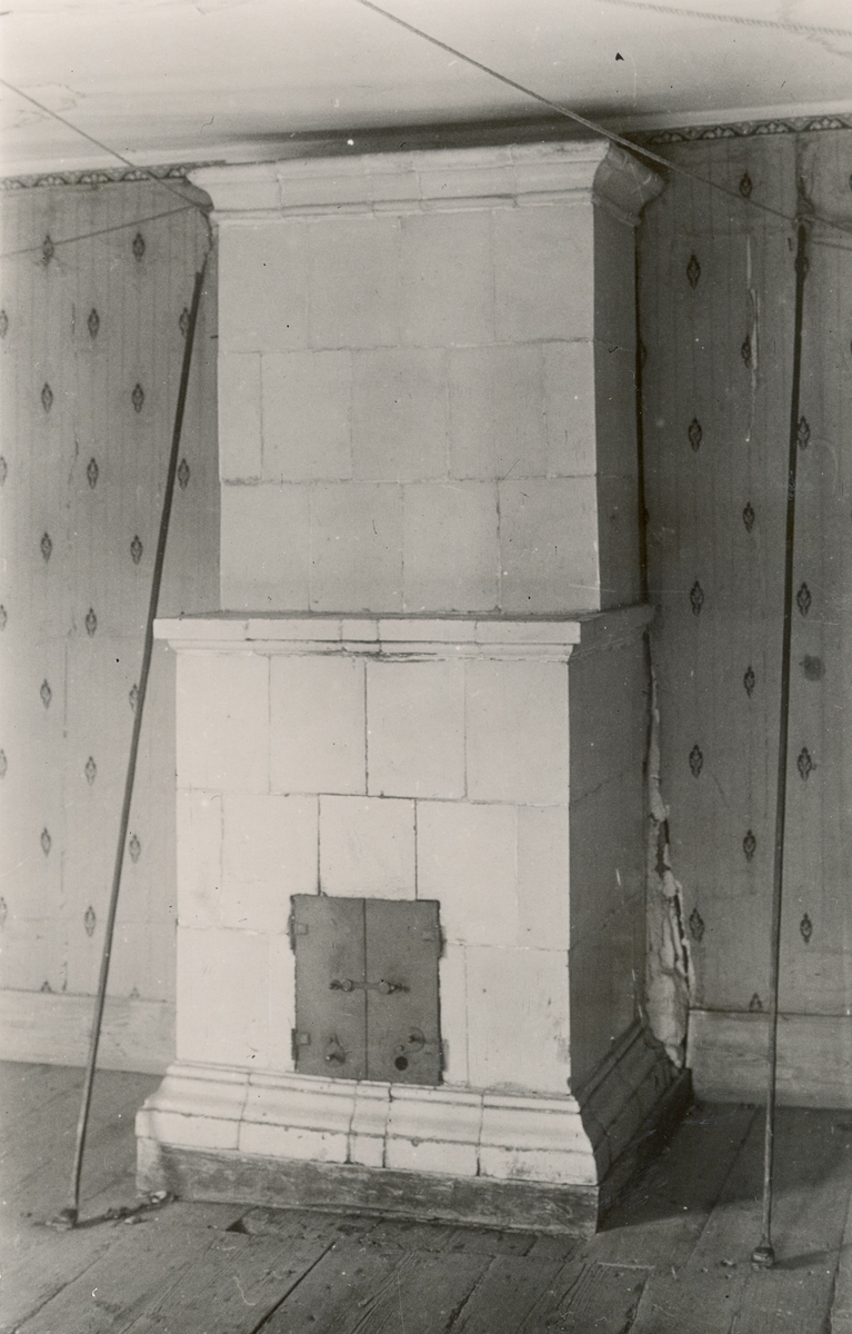 Kakelugn i nattstugan en trappa upp i gamla tvåvåningshuset.
