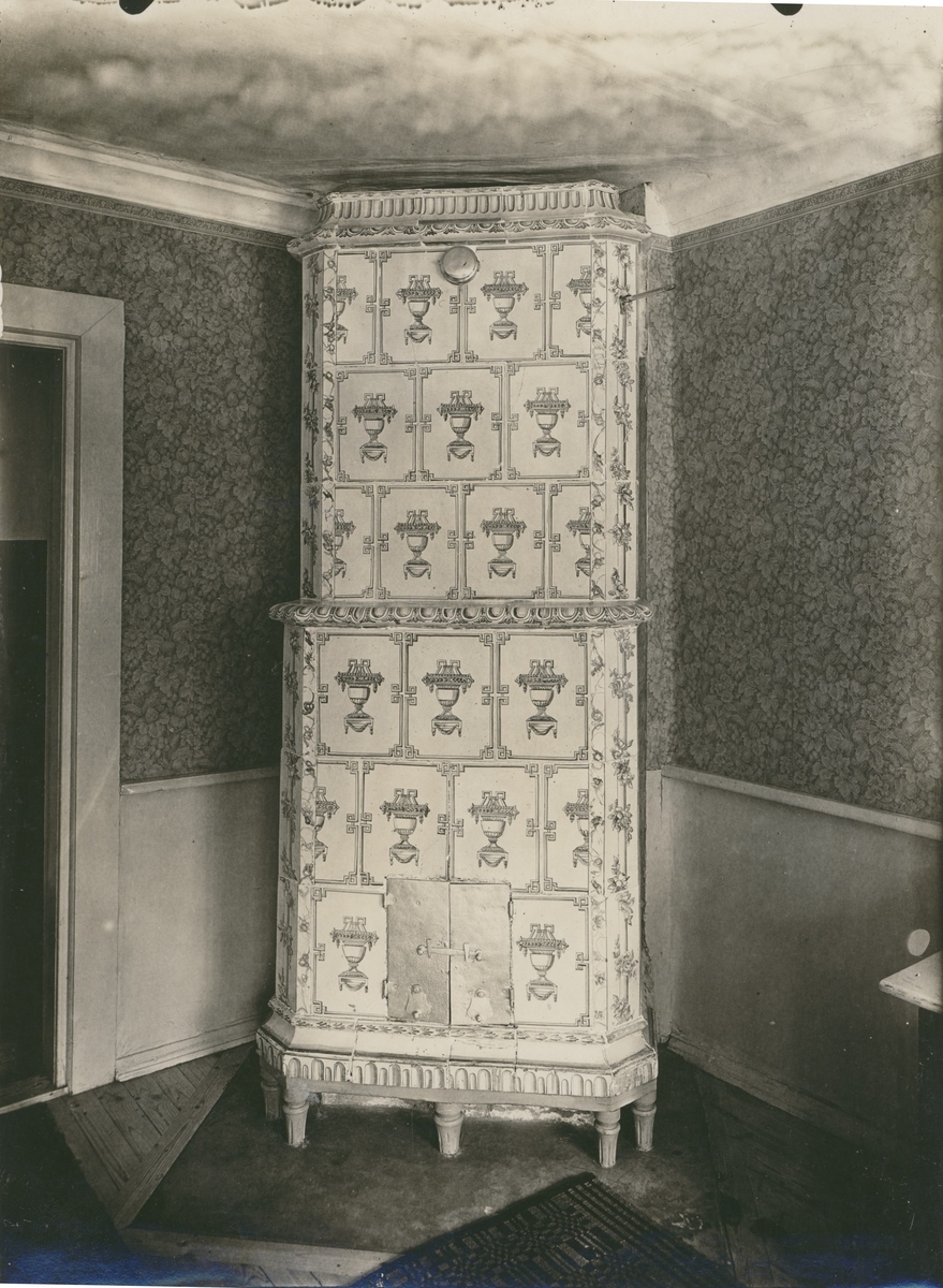 En kakelugn som är dekorerat i blått i rum tre på bottenvåningen i Fredriksbergs herrgård.