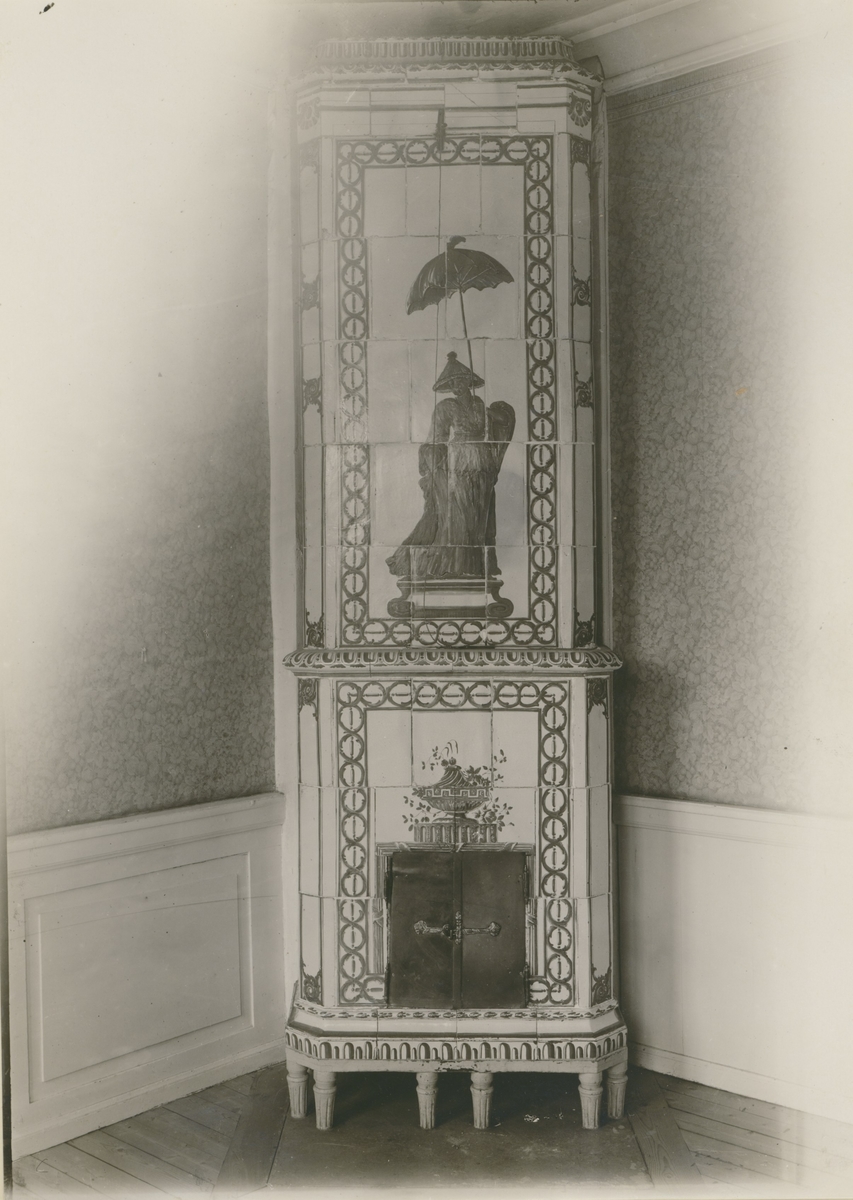 En dekorerad kakelugn på övervåningen i Fredriksbergs herrgård.