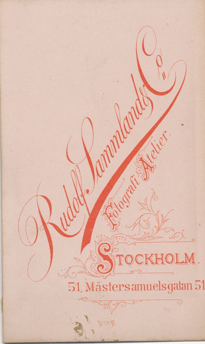 Tryckt text på fotots baksida: "Rudolf Sammland & Co Fotografi Atelier Stockholm 51, Mästersamuelsgatan 51"
