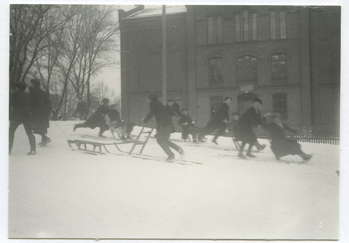 Kälkåkning i Cellgraven utanför Tullbroskolan 1930.