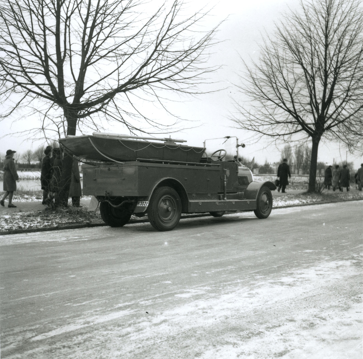 En räddningsbil med båt på flaket under firandet av Kalmar brandkårs 40-årsjubileum den 1:a januari 1946.