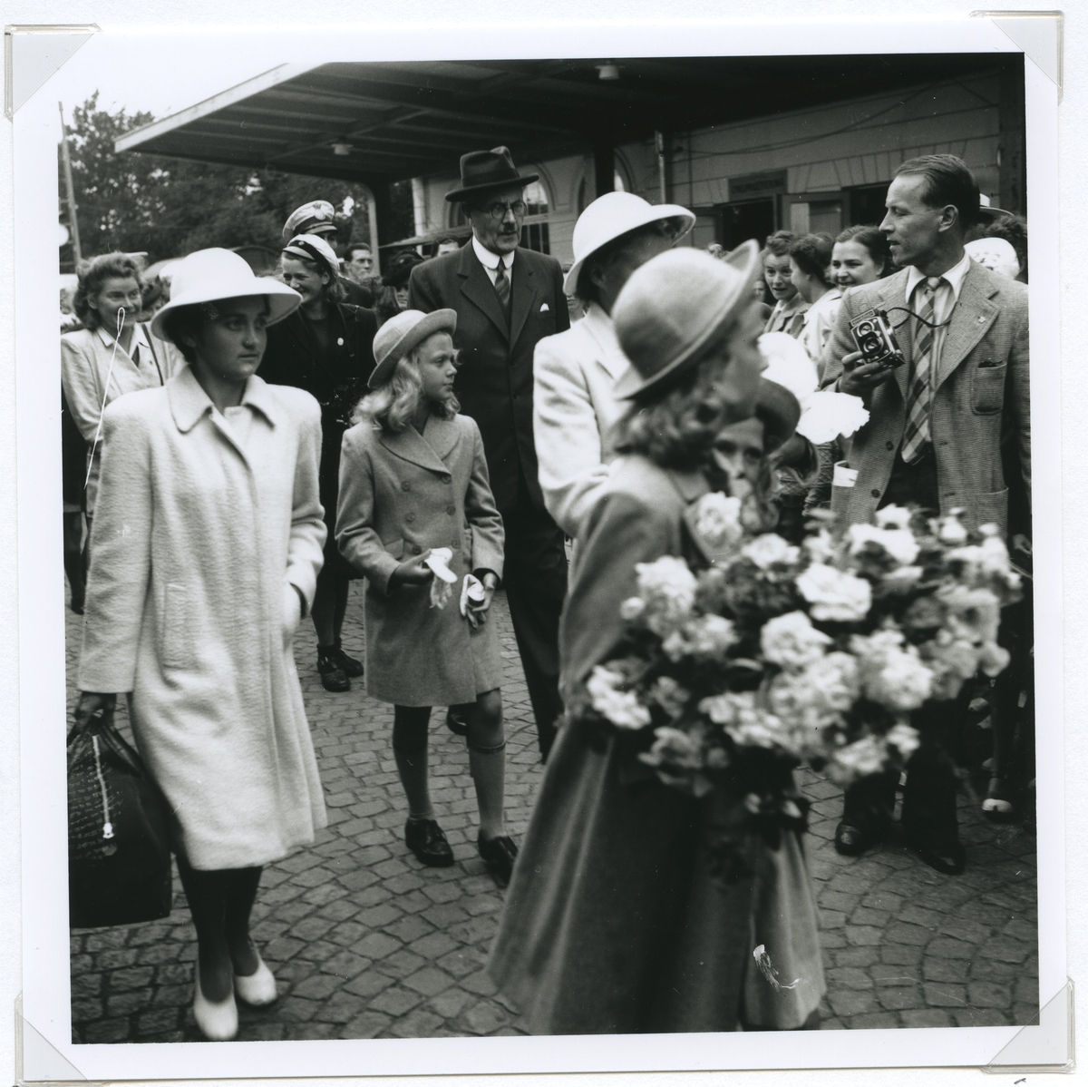 Prinsessorna Margareta och Birgitta på Kalmar Central. I mitten i bakgrunden syns också landshövding Arvid Lidén.