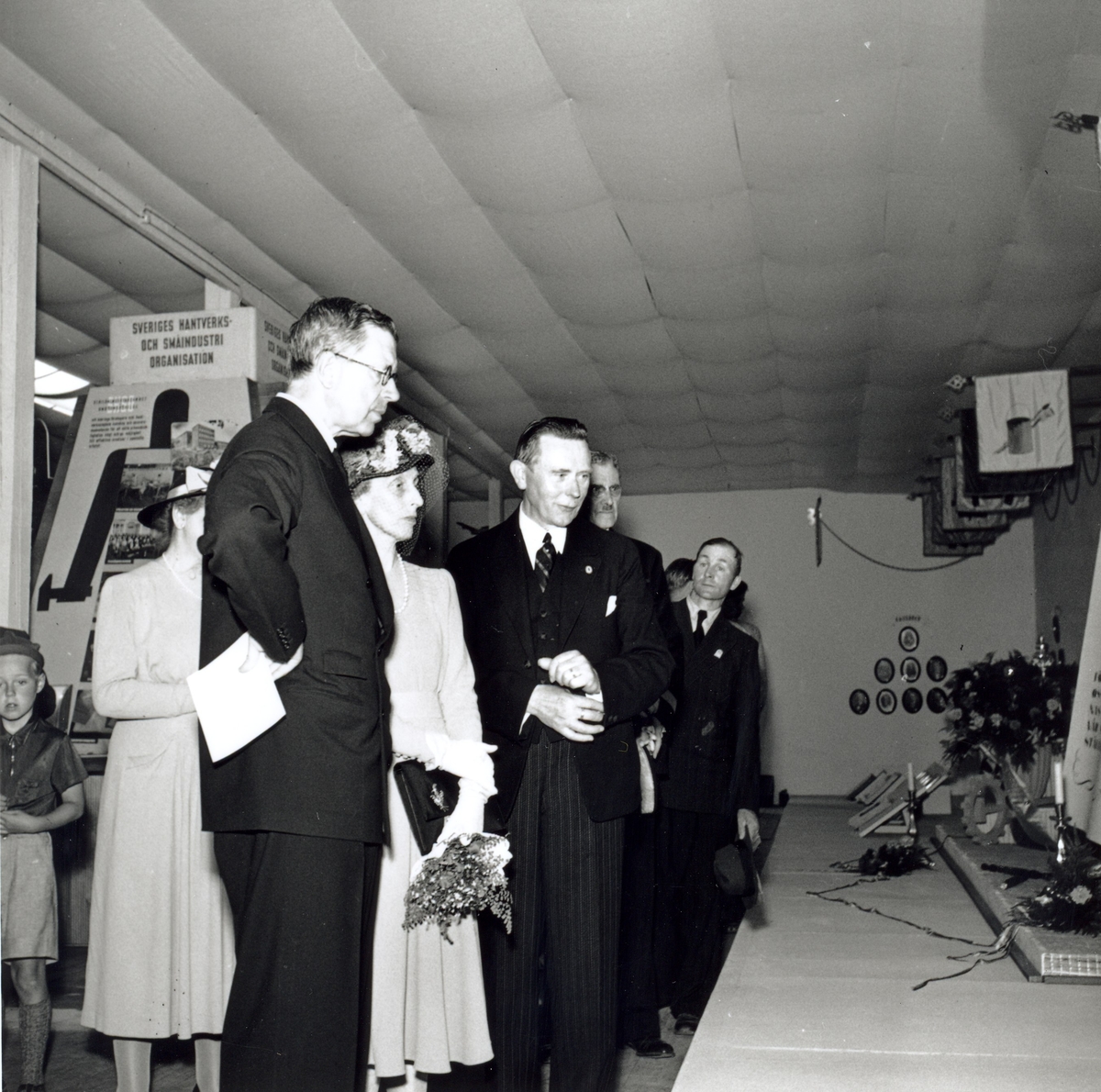 Dåvarande kronprinsen Gustaf Adolf med hustrun Louise besöker hantverksmässan i Kalmar 1947.