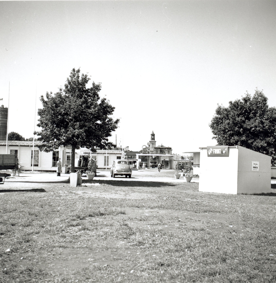 Vy från området vid Fredriksskans där hantverksmässan 1947 hölls. Till höger syns en kiosk som sålde frukt.
