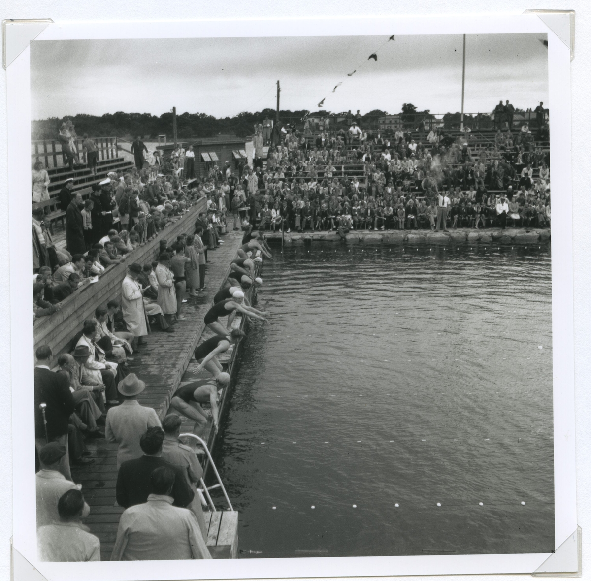 Ögonblicksbild från SM i simning, som hölls vid Långviksbadet i Kalmar 1946.
