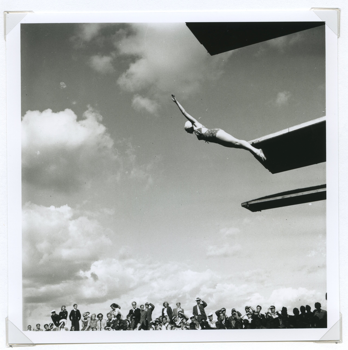 En kvinnlig deltagare hoppar i vattnet under SM i simning, som 1946 hölls vid Stenviksbadet i Kalmar.