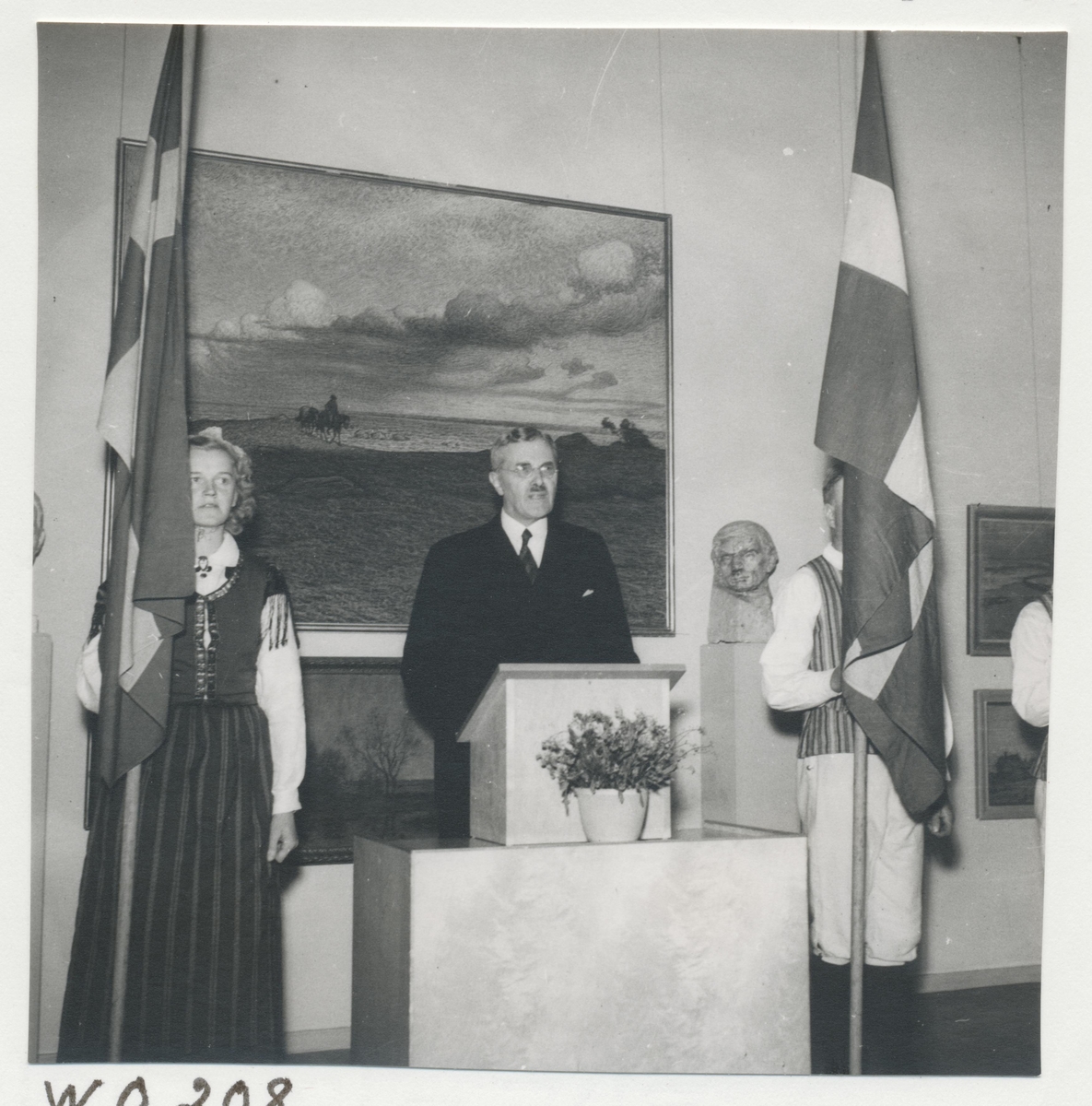 Landshövding Lindén håller tal, flankerad av två personer i folkdräkter.