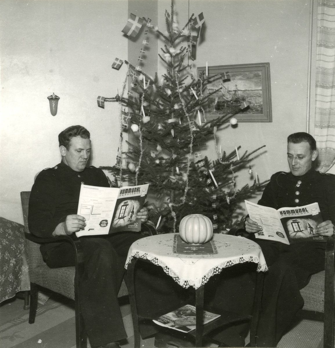Jul på brandstationen i Kalmar 1946. Två brandmän läser Kommunalarbetarens julutgåva.
