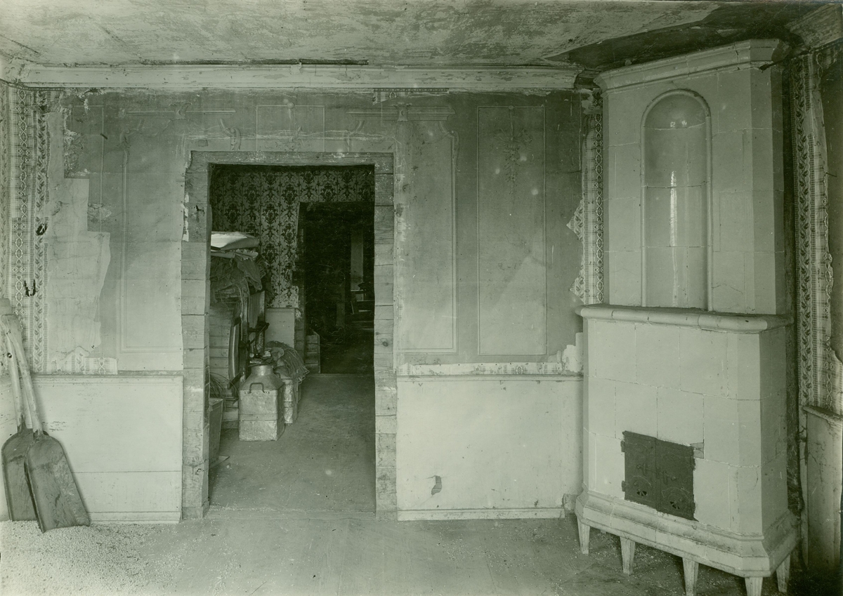 Huvudbyggningen: hörnkammare bakom salen. Gustaviansk väggdekor på papp. Gul kakelugn från 1700- talets slut.