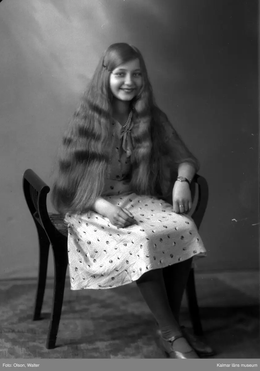 Ateljébild på en flicka i klänning sittandes på en pall. Enligt Walter Olsons journal är bilden beställd av fröken Amy Gustavsson.