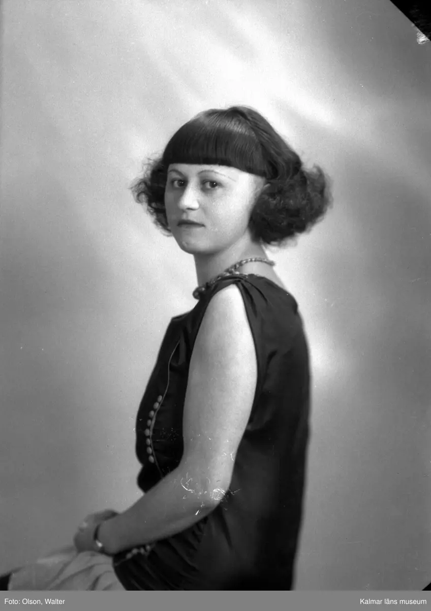 Ateljébild på en kvinna i armbandsur, pärlhalsband och klänning. Enligt Walter Olsons journal är bilden beställd av fröken Astrid Bergquist.