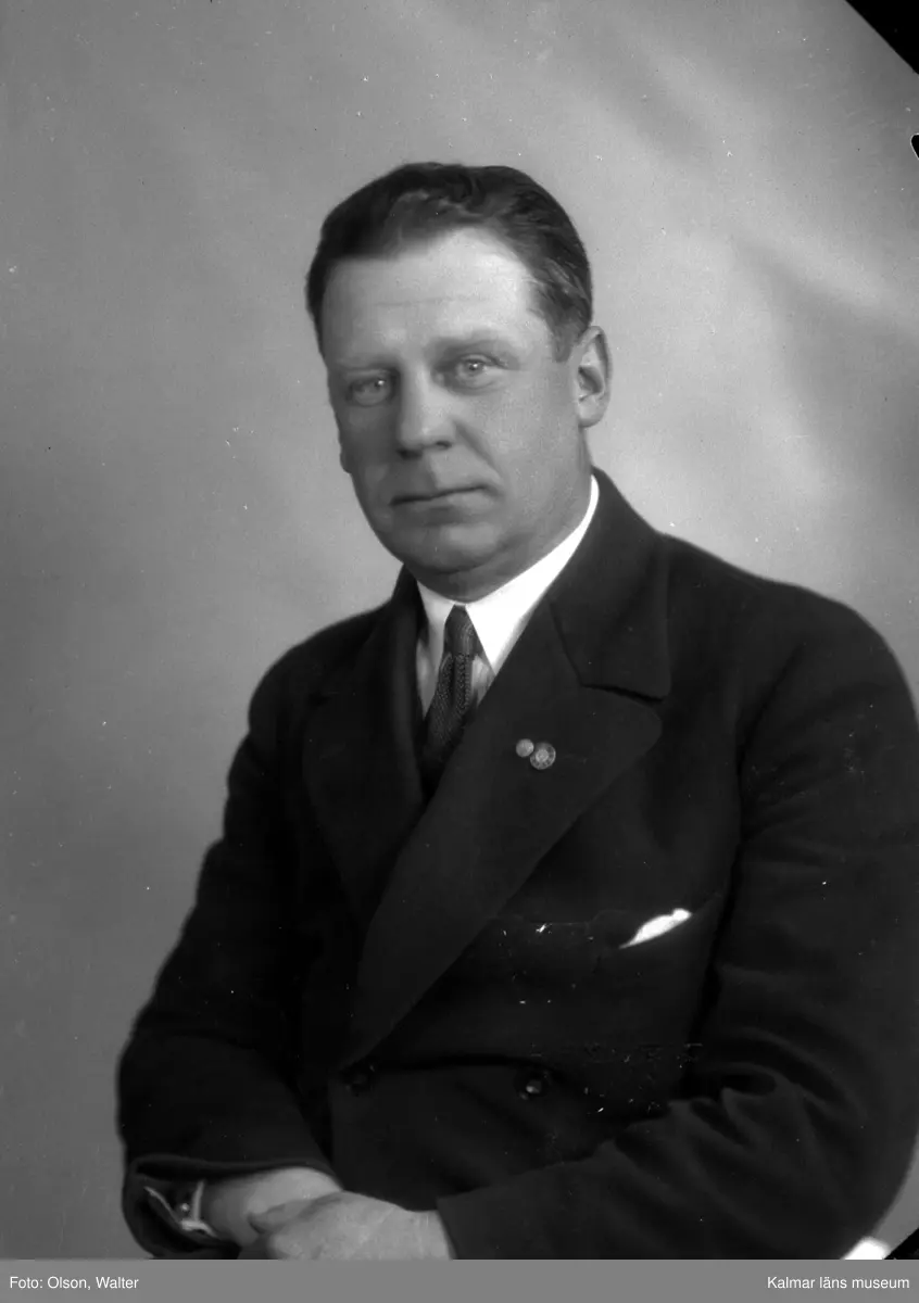 Ateljébild på en man i kostym. Enligt Walter Olsons journal är bilden beställd av bilbesiktningsman F Sundberg ifrån Villa Turnbo.