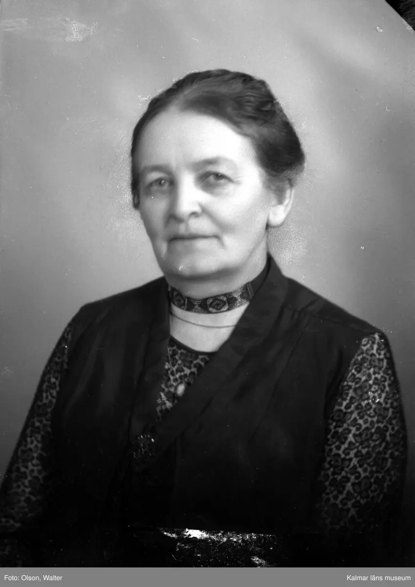 Ateljébild på en kvinna i håruppsättning och halsband. Enligt Walter Olsons journal är bilden beställd av fru kyrkoherde I Hansson.
