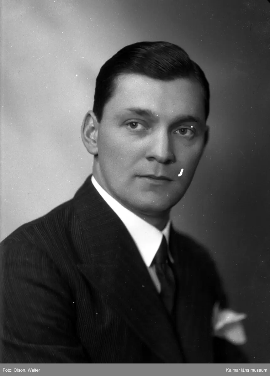 Ateljébild på en man i kostym. Enligt Walter Olsons journal är bilden beställd av doktor Boström.