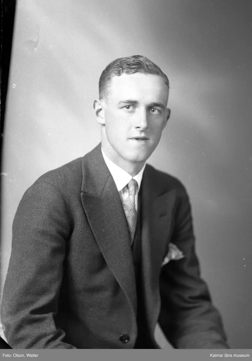 Ateljébild på en man i kostym och väst. Enligt Walter Olsons journal är bilden beställd av kandidat K-G Slettengren.