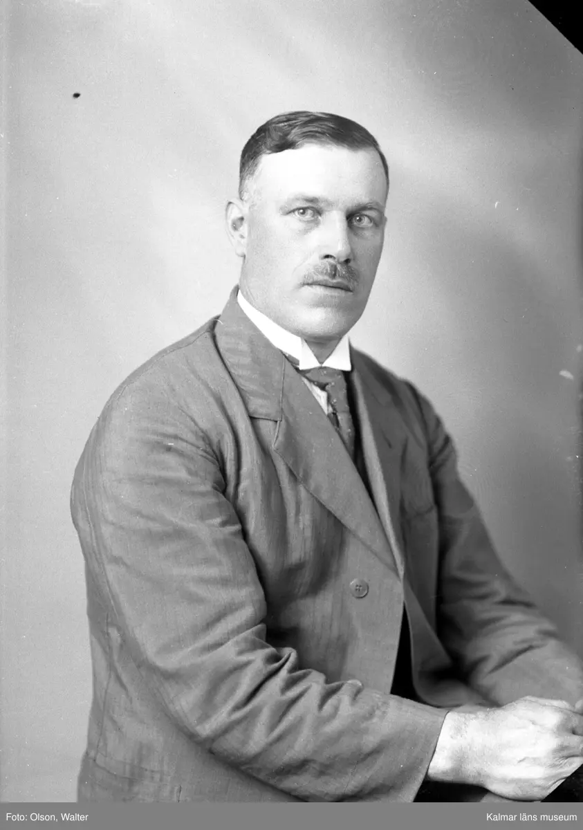 Ateljébild på en man i kostym och stärkkrage. Enligt Walter Olsons journal är bilden beställd av filosofie magister E Andersson ifrån Villa Svea i Eksjö.