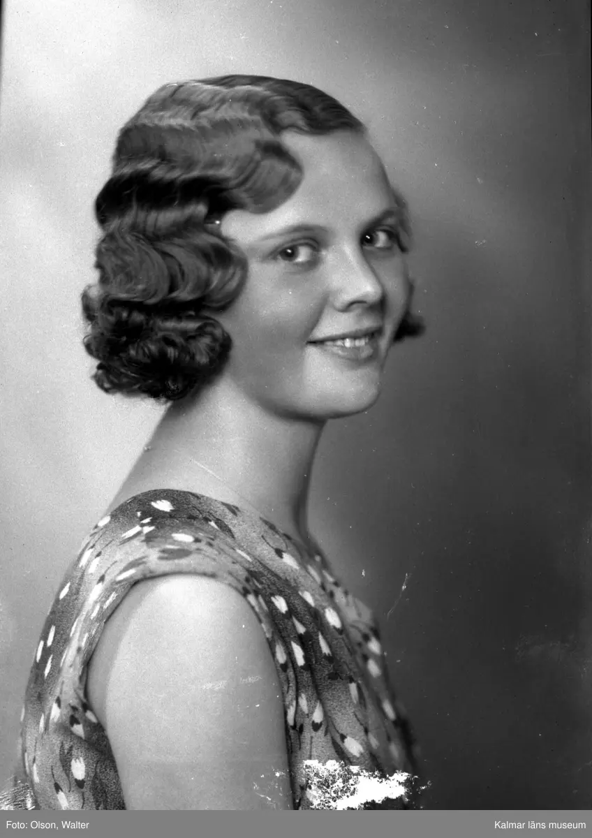 Ateljébild på en kvinna i klänning. Enligt Walter Olsons journal är bilden beställd av Margit Svensson.
