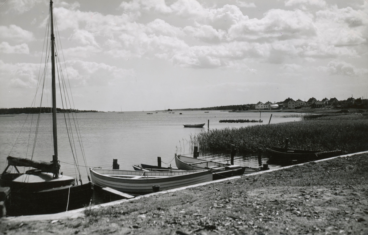 Vy över Mönsteråsviken hamn med fritidsbåtar och Östersjön.