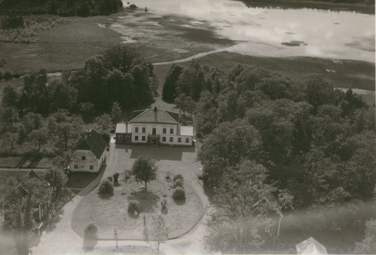 Flygfoto över en herrgård med flygelbyggnad och park.