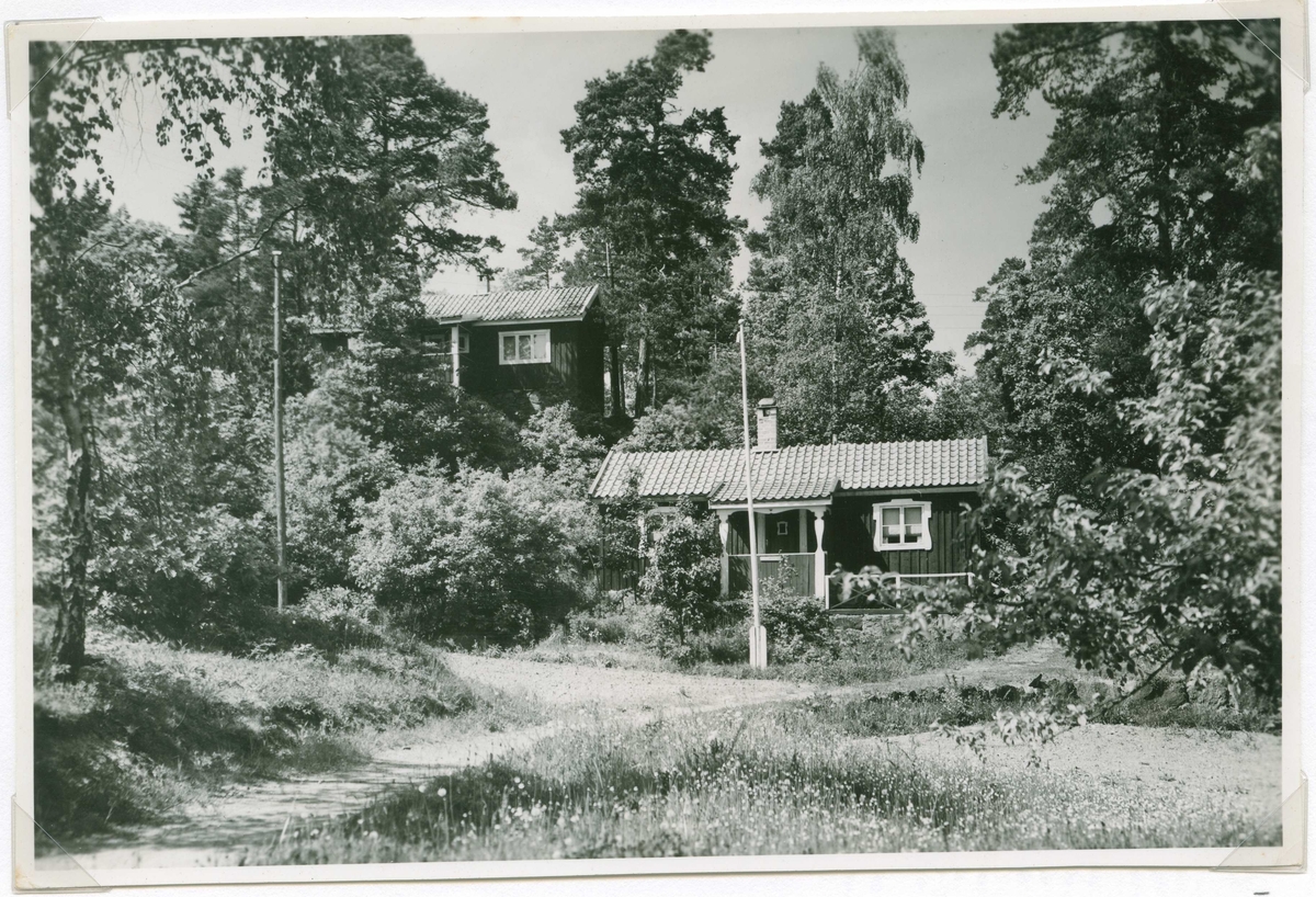 Vy på Hjorted Misterhults s.n, Mörtfors badort, stugor med omgivande träd.