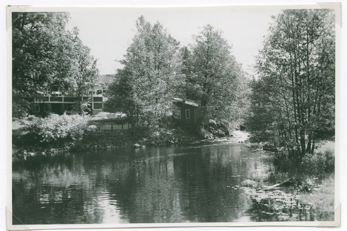 Vy över Hjorted och Misterhults s.r, Mörtfors badrestaurang, med ån rinnande framför.