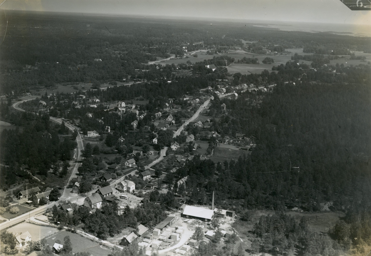Flygfoto över Svalliden med bygatan bostadshus och träindustri.