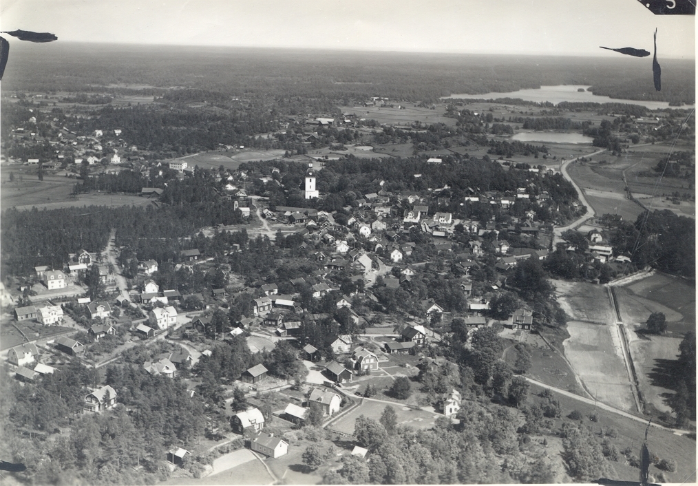 Flygfoto över Kristdala. Samhället med hus, kyrka och grusväg.