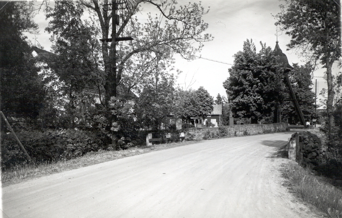 Vägen genom Påryd med Karlslunda kyrkas klockstapel i fonden.