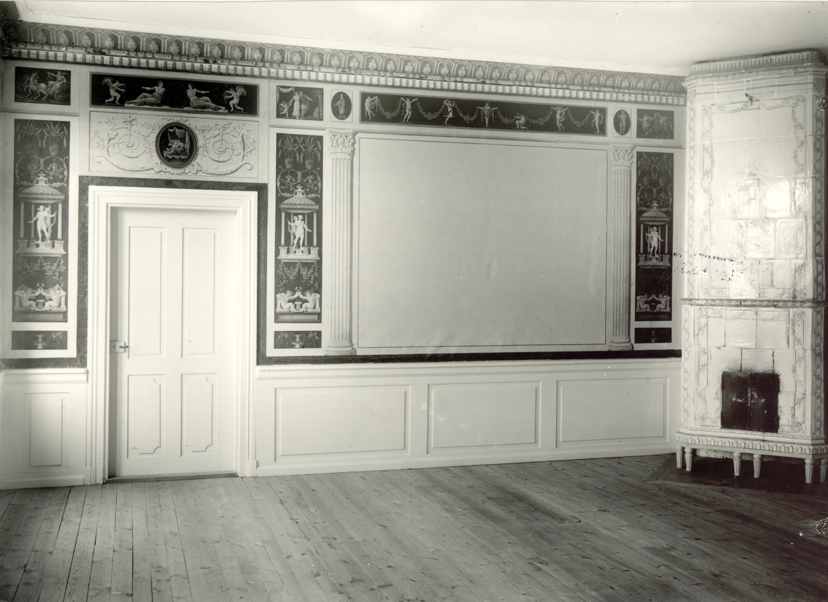Väggmålning och kakelugn i Fredriksbergs herrgård.