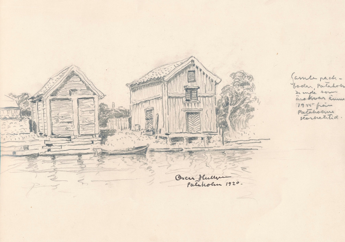 Pataholms hamn med de kvarstående gamla magasinen på norra sidan. Teckning av Oscar Hullgren. Kalmar läns museum.