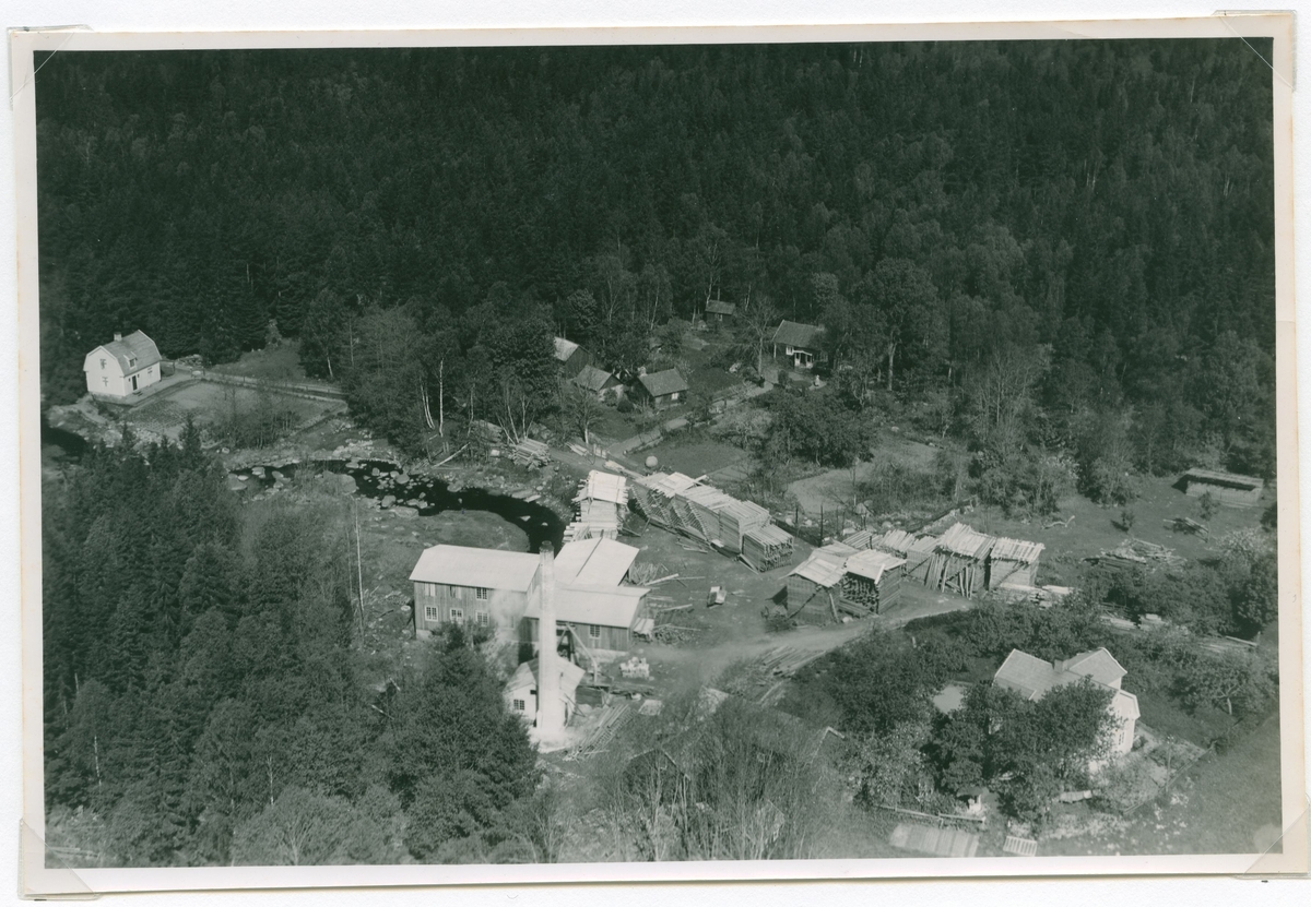 Flygbild över ett sågverk i Torsås. På bilden syns även ett antal bostadshus i anslutning till sågverket.