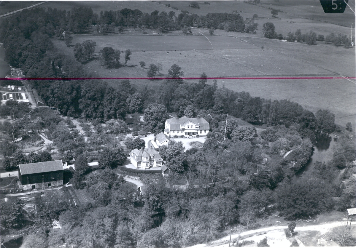 Ljungbyholms gård med ekonomibyggnader. Märk den röda linjen tvärs över bildytan. Den härrör från den statliga granskningen av flygbilder, avsedda att publiceras.