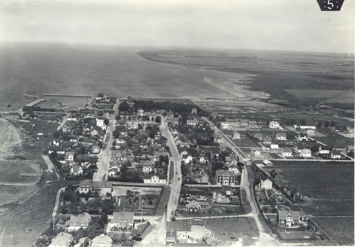 Flygbild över Mörbylånga från söder. I bildens mellanplan till vänster syns hamnanläggningen. Järnägsspåret från norr in mot Mörbylånga kan anas i högerkanten.