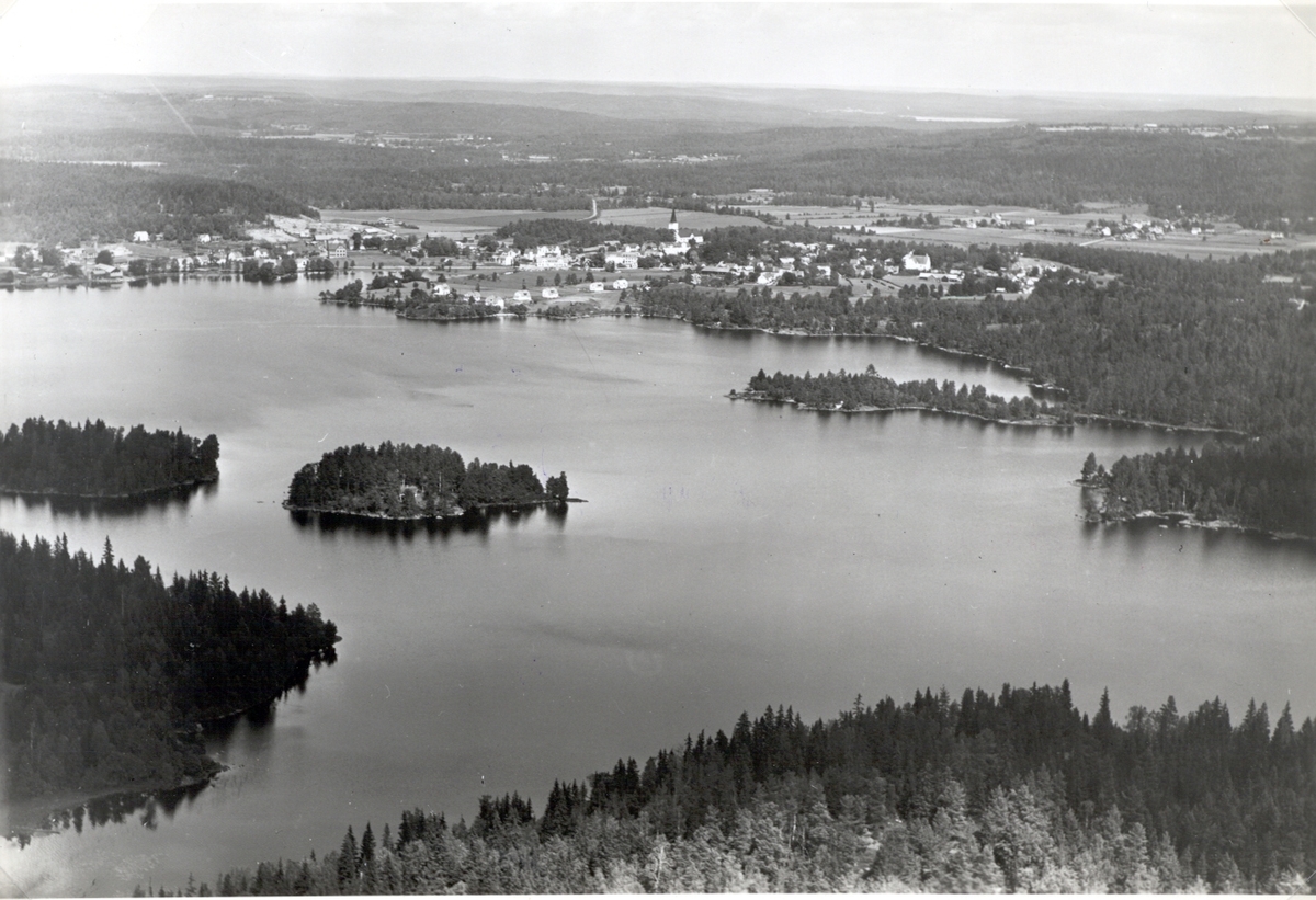Flygbild över Virserum från sydväst med Virserumssjön i förgrunden.
