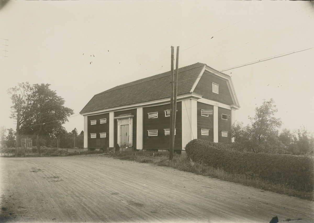 Sockenmagasin, uppfört 1803. Nakna rödfärgade timmerväggar, vita hörnlisener, lister och foder. Ribbutformad portal, Trappa med två stående gjutjärnsposter med text.