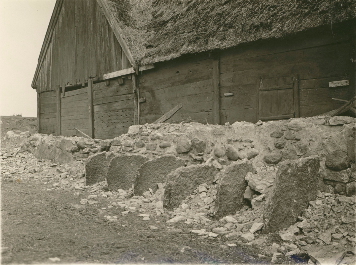 Båsbalkar av kalksten i en riven ladugårdslänga.