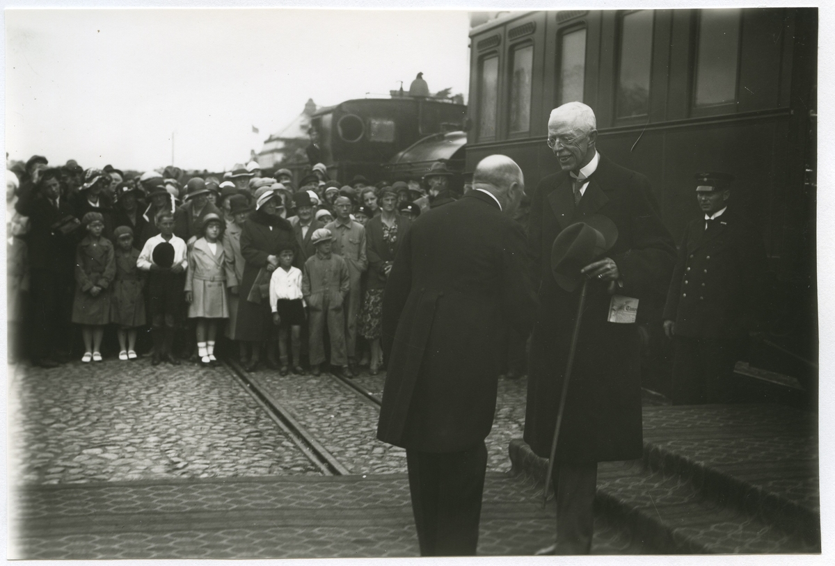 Gustav V hälsas välkommen till Kalmar då han anländer med det s k kungatåget.
