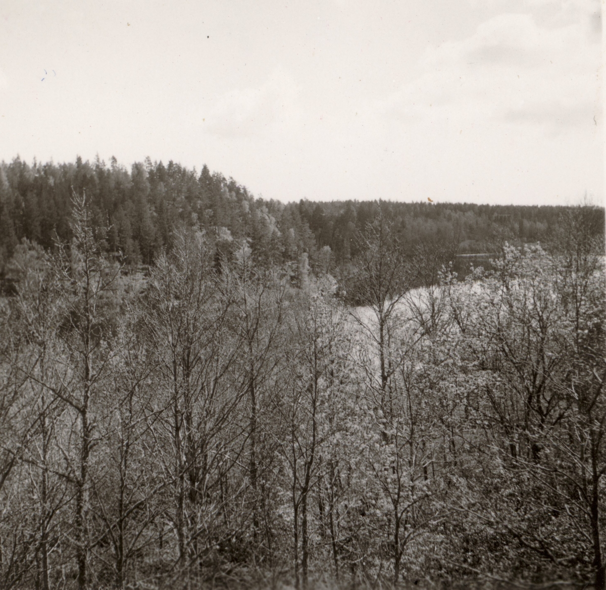 Vy over skogen i Bjurvik. Mellan träden kan man skymta vatten.