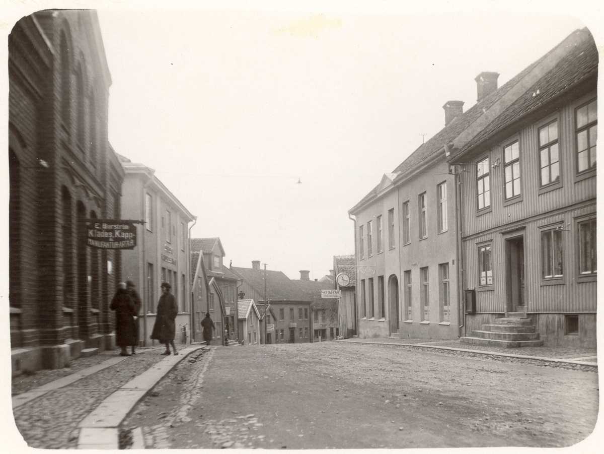 Stadsbild från Mönsterås. Till vänster syns E. Burströms klädes, kapp- och manufakturaffär.