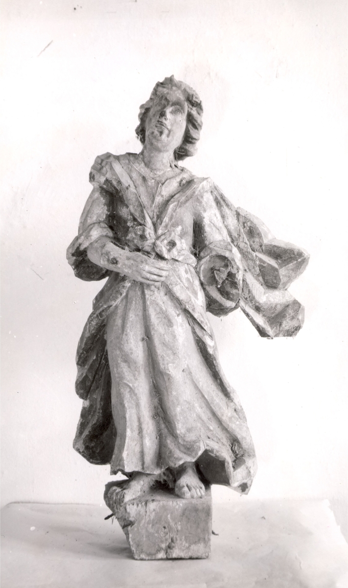 Skulpturen är en putto. En allegorisk liten amorin som ofta ingick som staffage i altaruppsättningar eller (ännu vanligare) på orgelfronter. De hade i sina händer olika ikonografiska föremål som tydliggjorde sammanhangen.